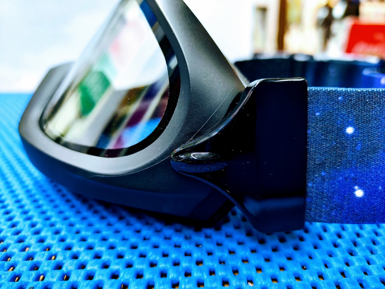 OTG設計是Over The Glasses的意思,也就是說這款雪鏡的設計是讓戴眼鏡的也可以使用的雪鏡,而且這款所使用的鏡片也是全視線感光鏡片(Photochromic),也就是會隨著光線來變色,越亮它就越暗,沒陽光時,幾乎就是透明的,就算要夜滑也是看得很清楚。透光率範圍約是 25%-84% ,變色範圍非常的廣,可以應付各種天色。
